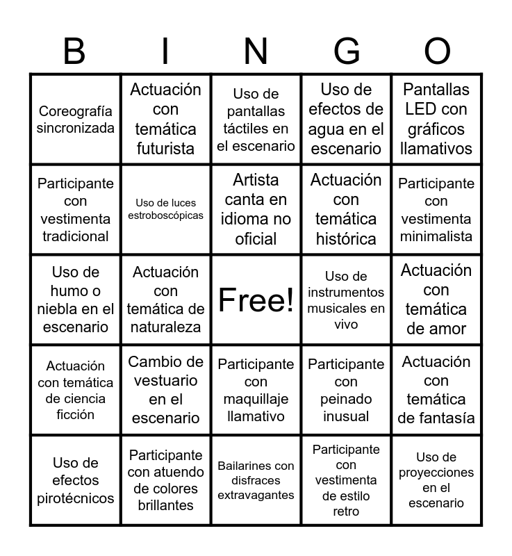 This bingo card has a free space and 25 words: Cambio de vestuario en el escenario, Bailarines con disfraces extravagantes, Artista canta en idioma no oficial, Uso de efectos pirotécnicos, Pantallas LED con gráficos llamativos, Coreografía sincronizada, Participante con vestimenta tradicional, Actuación con temática futurista, Uso de instrumentos musicales en vivo, Participante con maquillaje llamativo, Actuación con temática histórica, Uso de humo o niebla en el escenario, Participante con peinado inusual, Actuación con temática de fantasía, Uso de luces estroboscópicas, Participante con atuendo brillante, Actuación con temática de amor, Uso de pantallas táctiles en el escenario, Participante con vestimenta minimalista, Actuación con temática de naturaleza, Uso de proyecciones en el escenario, Participante con atuendo de colores brillantes, Actuación con temática de ciencia ficción, Uso de efectos de agua en el escenario and Participante con vestimenta de estilo retro.