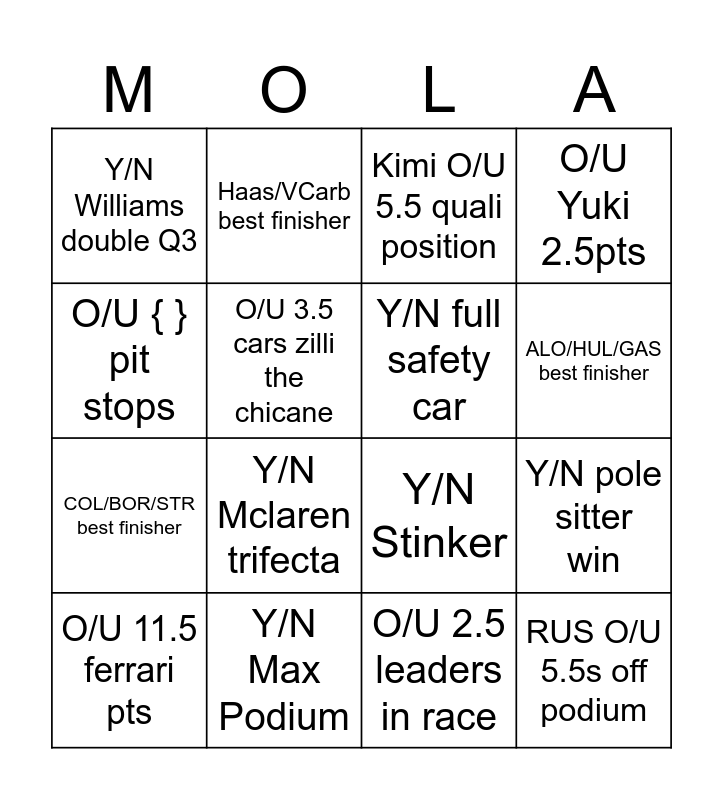 This bingo card has 16 words: Y/N Max Podium, Y/N pole sitter win, Kimi O/U 5.5 quali position, Y/N Williams double Q3, COL/BOR/STR best finisher, Haas/VCarb best finisher, Y/N Stinker, O/U 2.5 leaders in race, O/U { } pit stops, O/U 3.5 cars zilli the chicane, O/U 11.5 ferrari pts, O/U Yuki 2.5pts, Y/N Mclaren trifecta, ALO/HUL/GAS best finisher, Y/N full safety car and RUS O/U 5.5s off podium.