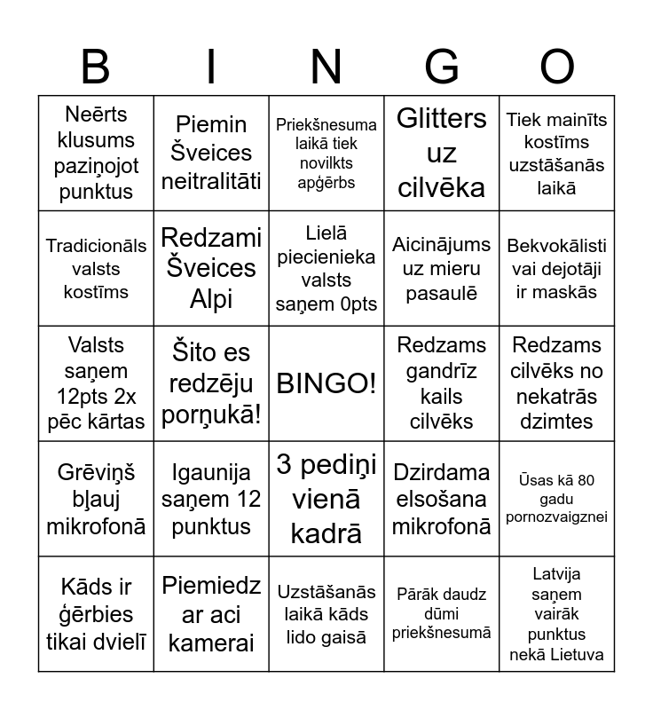 This bingo card has a free space and 24 words: Igaunija saņem 12 punktus, Piemiedz ar aci kamerai, Lielā piecienieka valsts saņem 0pts, Kāds ir ģērbies tikai dvielī, Tiek mainīts kostīms uzstāšanās laikā, Neērts klusums paziņojot punktus, Tradicionāls valsts kostīms, Piemin Šveices neitralitāti, Redzams gandrīz kails cilvēks, 3 pediņi vienā kadrā, Aicinājums uz mieru pasaulē, Valsts saņem 12pts 2x pēc kārtas, Dzirdama elsošana mikrofonā, Ūsas kā 80 gadu pornozvaigznei, Redzami Šveices Alpi, Pārāk daudz dūmi priekšnesumā, Redzams cilvēks no nekatrās dzimtes, Priekšnesuma laikā tiek novilkts apģērbs, Bekvokālisti vai dejotāji ir maskās, Šito es redzēju porņukā!, Latvija saņem vairāk punktus nekā Lietuva, Grēviņš bļauj mikrofonā, Glitters uz cilvēka and Uzstāšanās laikā kāds lido gaisā.