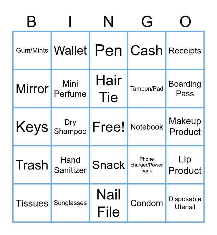 This bingo card has a free space and 24 words: Hand Sanitizer, Sunglasses, Hair Tie, Tissues, Receipts, Gum/Mints, Mirror, Wallet, Notebook, Snack, Tampon/Pad, Keys, Phone charger/Power bank, Lip Product, Mini Perfume, Condom, Makeup Product, Pen, Boarding Pass, Dry Shampoo, Disposable Utensil, Trash, Cash and Nail File.