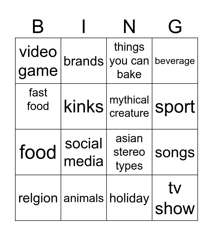 This bingo card has 16 words: animals, songs, things you can bake, video game, food, brands, asian stereo types, holiday, fast food, kinks, relgion, beverage, social media, sport, mythical creature and tv show.