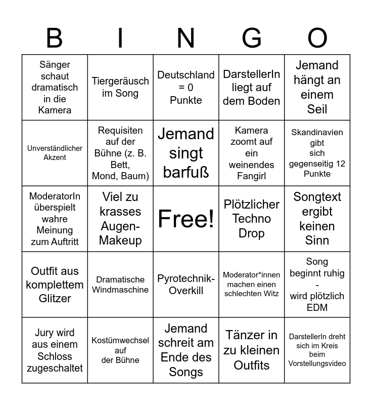 This bingo card has a free space and 24 words: Dramatische Windmaschine, Kostümwechsel auf der Bühne, Jemand singt barfuß, Jury wird aus einem Schloss zugeschaltet, Jemand hängt an einem Seil, Sänger schaut dramatisch in die Kamera, Unverständlicher Akzent, Tiergeräusch im Song, Plötzlicher Techno Drop, Pyrotechnik-Overkill, Kamera zoomt auf ein weinendes Fangirl, ModeratorIn überspielt wahre Meinung zum Auftritt, Moderator*innen machen einen schlechten Witz, Song beginnt ruhig - wird plötzlich EDM, Requisiten auf der Bühne (z. B. Bett, Mond, Baum), Tänzer in zu kleinen Outfits, Songtext ergibt keinen Sinn, Deutschland = 0 Punkte, Skandinavien gibt sich gegenseitig 12 Punkte, Viel zu krasses Augen-Makeup, DarstellerIn dreht sich im Kreis beim Vorstellungsvideo, Outfit aus komplettem Glitzer, DarstellerIn liegt auf dem Boden and Jemand schreit am Ende des Songs.