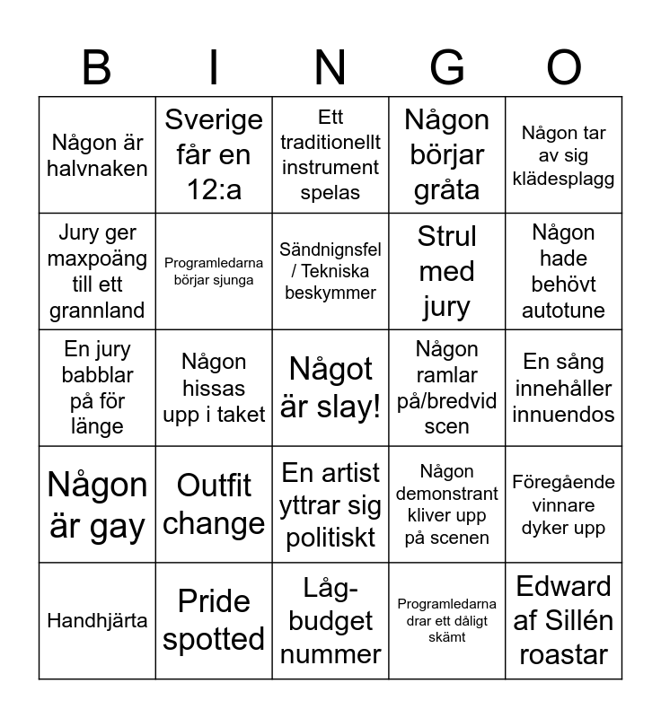 This bingo card has a free space and 24 words: Outfit change, Pride spotted, Sändnignsfel / Tekniska beskymmer, Handhjärta, Någon tar av sig klädesplagg, Någon är halvnaken, Jury ger maxpoäng till ett grannland, Sverige får en 12:a, Någon ramlar på/bredvid scen, En artist yttrar sig politiskt, Strul med jury, En jury babblar på för länge, Någon demonstrant kliver upp på scenen, Föregående vinnare dyker upp, Programledarna börjar sjunga, Programledarna drar ett dåligt skämt, En sång innehåller innuendos, Ett traditionellt instrument spelas, Någon hade behövt autotune, Någon hissas upp i taket, Edward af Sillén roastar, Någon är gay, Någon börjar gråta and Låg-budget nummer.