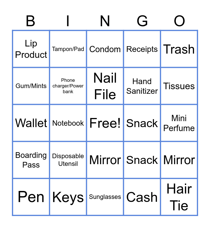 This bingo card has a free space and 24 words: Disposable Utensil, Keys, Nail File, Pen, Trash, Lip Product, Gum/Mints, Tampon/Pad, Snack, Mirror, Hand Sanitizer, Wallet, Snack, Mirror, Phone charger/Power bank, Cash, Mini Perfume, Condom, Tissues, Notebook, Hair Tie, Boarding Pass, Receipts and Sunglasses.