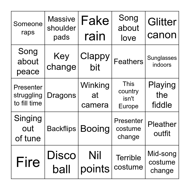 This bingo card has 35 words: Thanks host for a great night, UK gets one point, UK gets 12 points, Key change, Booing, Song about love, Song about peace, Audience member with flag face paint, Clappy bit, Obvious fake instument playing, Presenter struggling to fill time, Glitter canon, Sequins, Wind Machine, Someone raps, This country isn't Europe, Terrible costume, Dragons, Singing out of tune, Winking at camera, Presenter costume change, Fire, Pleather outfit, Disco ball, Fake rain, Sunglasses indoors, Mid-song costume change, Blatant political voting, Feathers, Playing the fiddle, Traditional dress, Nil points, Backflips, Massive shoulder pads and Treadmill.