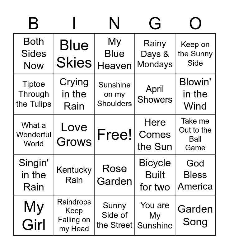 This bingo card has a free space and 28 words: God Bless America, Home on the Range, April Showers, You are My Sunshine, Tiptoe Through the Tulips, My Blue Heaven, Blue Skies, Singin' in the Rain, Here Comes the Sun, My Girl, What a Wonderful World, Rainy Days & Mondays, Raindrops Keep Falling on my Head, Sunny Side of the Street, Blowin' in the Wind, Over the Rainbow, Kentucky Rain, Crying in the Rain, Sunshine on my Shoulders, Rose Garden, Both Sides Now, In the Garden, Garden Song, Love Grows, Take me Out to the Ball Game, Bicycle Built for two, Keep on the Sunny Side and Tie a Yellow Ribbon.