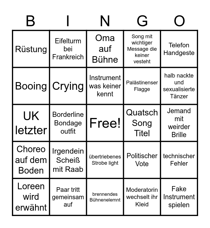 This bingo card has a free space and 25 words: Loreen wird erwähnt, Irgendein Scheiß mit Raab, Instrument was keiner kennt, Moderatorin wechselt ihr Kleid, halb nackte und sexualisierte Tänzer, Rüstung, Eifelturm bei Frankreich, Oma auf Bühne, Palästinenser Flagge, technischer Fehler, UK letzter, Crying, Politischer Vote, Fake Instrument spielen, Booing, Paar tritt gemeinsam auf, brennendes Bühnenelemnt, Song mit wichtiger Message die keiner vesteht, Jemand mit weirder Brille, Choreo auf dem Boden, Borderline Bondage outfit, übertriebenes Strobe light, Quatsch Song Titel, Telefon Handgeste and Anspielung auf Donald Trump.
