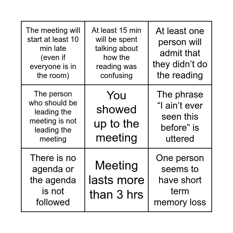 This bingo card has a free space and 8 words: The phrase “I ain’t ever seen this before” is uttered, At least one person will admit that they didn’t do the reading, At least 15 min will be spent talking about how the reading was confusing, There is no agenda or the agenda is not followed, The meeting will start at least 10 min late (even if everyone is in the room), One person seems to have short term memory loss, The person who should be leading the meeting is not leading the meeting and Meeting lasts more than 3 hrs.