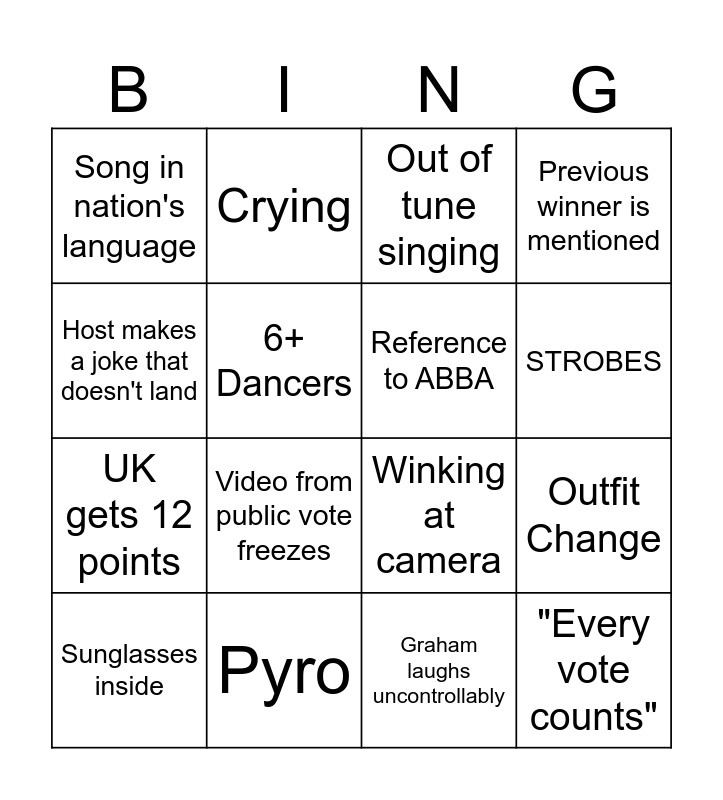 This bingo card has 16 words: Pyro, Outfit Change, Out of tune singing, Song in nation's language, UK gets 12 points, Crying, Winking at camera, Graham laughs uncontrollably, Host makes a joke that doesn't land, 6+ Dancers, Sunglasses inside, Previous winner is mentioned, Video from public vote freezes, STROBES, Reference to ABBA and "Every vote counts".