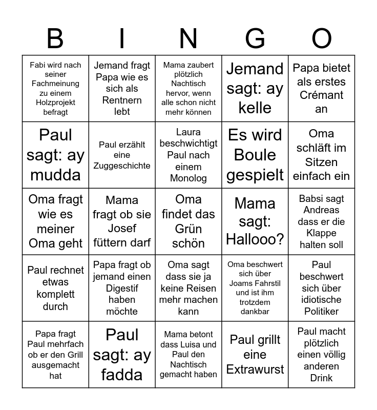 This bingo card has a free space and 29 words: Papa fragt Paul mehrfach ob er den Grill ausgemacht hat, Oma nennt Fabi Chef, Mama fragt ob sie Josef füttern darf, Papa schickt Paul zum Getränke holen, Fabi wird nach seiner Fachmeinung zu einem Holzprojekt befragt, Mama zaubert plötzlich Nachtisch hervor, wenn alle schon nicht mehr können, Paul erzählt eine Zuggeschichte, Papa fragt ob jemand einen Digestif haben möchte, Mama sagt: Hallooo?, Paul sagt: ay fadda, Babsi sagt Andreas dass er die Klappe halten soll, Paul macht plötzlich einen völlig anderen Drink, Mama betont dass Luisa und Paul den Nachtisch gemacht haben, Paul grillt eine Extrawurst, Oma schläft im Sitzen einfach ein, Oma sagt dass sie diese Geschmäcker nicht kennt, Oma sagt dass sie ja keine Reisen mehr machen kann, Paul rechnet etwas komplett durch, Papa bietet als erstes Crémant an, Oma fragt wie es meiner Oma geht, Oma beschwert sich über Joams Fahrstil und ist ihm trotzdem dankbar, Laura hat roadrage, Es wird Boule gespielt, Paul sagt: ay mudda, Jemand sagt: ay kelle, Jemand fragt Papa wie es sich als Rentnern lebt, Paul beschwert sich über idiotische Politiker, Laura beschwichtigt Paul nach einem Monolog and Oma freut sich dass keine LKWs auf der Bahn sind.