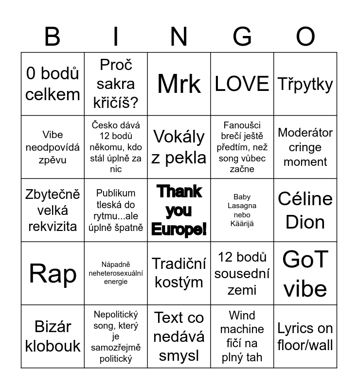 This bingo card has a free space and 24 words: Nápadně neheterosexuální energie, Nepolitický song, který je samozřejmě politický, Vokály z pekla, Bizár klobouk, Třpytky, 0 bodů celkem, Vibe neodpovídá zpěvu, Proč sakra křičíš?, Baby Lasagna nebo Käärijä, Tradiční kostým, Fanoušci brečí ještě předtím, než song vůbec začne, Zbytečně velká rekvizita, 12 bodů sousední zemi, GoT vibe, Česko dává 12 bodů někomu, kdo stál úplně za nic, Wind machine fičí na plný tah, Céline Dion, Mrk, Moderátor cringe moment, Publikum tleská do rytmu...ale úplně špatně, Lyrics on floor/wall, Rap, LOVE and Text co nedává smysl.