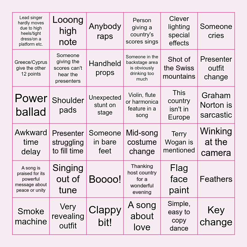 This bingo card has 39 words: Very revealing outfit, Smoke machine, Lady in red, Greece/Cyprus give the other 12 points, Someone in bare feet, Graham Norton is sarcastic, Someone giving the scores can't hear the presenters, Key change, Clever lighting special effects, Violin, flute or harmonica feature in a song, Presenter outfit change, Person giving a country's scores sings, Power ballad, Unexpected stunt on stage, Shoulder pads, This country isn't in Europe, Flag face paint, Lead singer hardly moves due to high heels/tight dress/on a platform etc., Clappy bit!, Awkward time delay, Someone cries, Terry Wogan is mentioned, Handheld props, Someone in the backstage area is obviously drinking too much, A song about love, Boooo!, A song is praised for its powerful message about peace or unity, Simple, easy to copy dance, Singing out of tune, Looong high note, Celine Dion reference, Feathers, Anybody raps, Mid-song costume change, Winking at the camera, Thanking host country for a wonderful evening, Presenter struggling to fill time, Shot of the Swiss mountains and Host calming down audience.