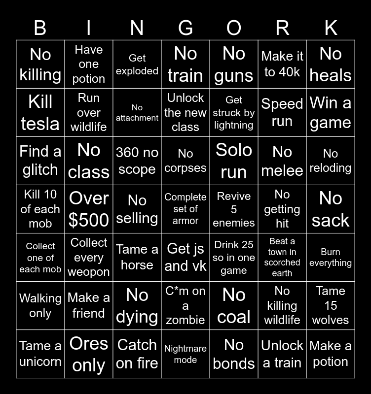 This bingo card has a free space and 48 words: No coal, Speed run, Nightmare mode, Over $500, 360 no scope, No sack, Have one potion, Ores only, Make it to 40k, Get js and vk, No heals, No train, No melee, Solo run, Walking only, No getting hit, Kill tesla, Win a game, No killing wildlife, No guns, Get struck by lightning, No selling, No killing, Run over wildlife, Tame 15 wolves, No attachment, No reloding, Tame a unicorn, No corpses, No class, Unlock a train, Revive 5 enemies, Burn everything, Make a friend, Kill 10 of each mob, Drink 25 so in one game, Beat a town in scorched earth, Find a glitch, Tame a horse, No dying, Collect one of each mob, Make a potion, Get exploded, Catch on fire, Unlock the new class, C*m on a zombie, Collect every weopon and No bonds.
