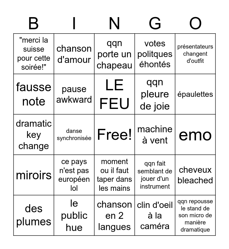 This bingo card has a free space and 24 words: ce pays n'est pas européen lol, le public hue, LE FEU, des plumes, présentateurs changent d'outfit, "merci la suisse pour cette soirée!", fausse note, chanson d'amour, machine à vent, moment ou il faut taper dans les mains, qqn pleure de joie, dramatic key change, qqn fait semblant de jouer d'un instrument, cheveux bleached, pause awkward, clin d'oeil à la caméra, emo, qqn porte un chapeau, épaulettes, danse synchronisée, qqn repousse le stand de son micro de manière dramatique, miroirs, votes politques éhontés and chanson en 2 langues.