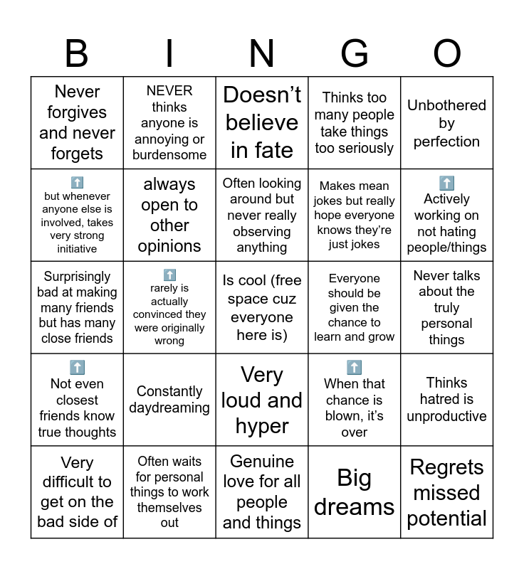 This bingo card has a free space and 24 words: Constantly daydreaming, Often waits for personal things to work themselves out, Often looking around but never really observing anything, Very difficult to get on the bad side of, Unbothered by perfection, Never forgives and never forgets, ⬆️ but whenever anyone else is involved, takes very strong initiative, NEVER thinks anyone is annoying or burdensome, Everyone should be given the chance to learn and grow, Very loud and hyper, Makes mean jokes but really hope everyone knows they’re just jokes, Surprisingly bad at making many friends but has many close friends, ⬆️ When that chance is blown, it’s over, Thinks hatred is unproductive, always open to other opinions, Big dreams, Never talks about the truly personal things, Doesn’t believe in fate, ⬆️ Actively working on not hating people/things, ⬆️ rarely is actually convinced they were originally wrong, Regrets missed potential, ⬆️ Not even closest friends know true thoughts, Thinks too many people take things too seriously and Genuine love for all people and things.