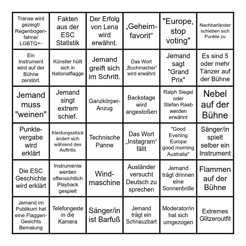 This bingo card has 42 words: Moderator/in hat sich umgezogen, Künstler hüllt sich in Nationalflagge, Traditionelles Kostüm / Tracht, Ralph Siegel oder Stefan Raab werden erwähnt, Sänger/in spielt selber ein Instrument, Kleidungsstück ändert sich während des Auftritts, Jemand muss "weinen", Handherzen für die Zuschauer, Der Erfolg von Lena wird erwähnt., Nebel auf der Bühne, Ganzkörper- Anzug, Das Wort „Buchmacher“ wird erwähnt, Es sind 5 oder mehr Tänzer auf der Bühne, "Europe, stop voting", Telefongeste in die Kamera, Punkte-vergabe wird erklärt, Flammen auf der Bühne, Jemand sagt "Grand Prix", Extremes Glitzeroutfit, Fakten aus der ESC Statistik, Nachbarländer schieben sich Punkte zu, Wind-maschine, Die ESC Geschichte wird erklärt, Transe wird gezeigt/ Regenbogen-fahne/ LGBTQ+-, Akrobatik auf der Bühne, Jemand im Publikum hat eine Flaggen- Gesichts Bemalung, Jemand greift sich im Schritt., Dem Gastgeber wird für den Abend gedankt, Instrumente werden offensichtlich Playback gespielt, Jemand trägt drinnen eine Sonnenbrille, Deutschland kriegt von einem Land mehr als 1P., Backstage wird angestoßen, Ein Instrument wird auf der Bühne zerstört., "Good Evening Europe good morning Australia", Sänger/in ist Barfuß, Technische Panne, Das Wort „Instagram“ fällt, Jemand singt extrem schief., Ausländer versucht Deutsch zu sprechen, Jemand trägt ein Schnauzbart, „Geheim- favorit“ and Das Baseler Rathaus wird gezeigt..