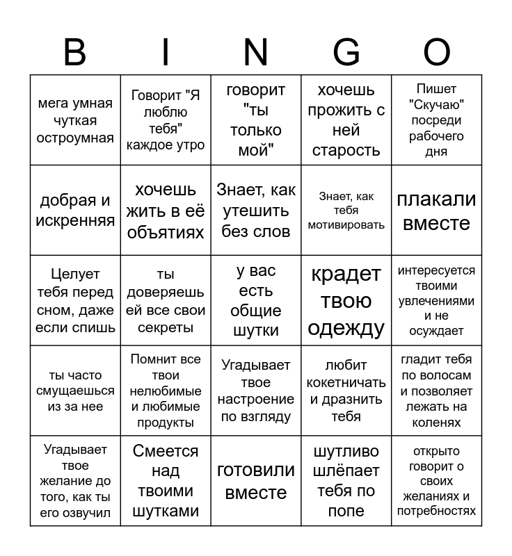 This bingo card has a free space and 24 words: Помнит все твои нелюбимые и любимые продукты, Смеется над твоими шутками, Знает, как утешить без слов, Угадывает твое желание до того, как ты его озвучил, Пишет "Скучаю" посреди рабочего дня, мега умная чуткая остроумная, добрая и искренняя, Говорит "Я люблю тебя" каждое утро, крадет твою одежду, Угадывает твое настроение по взгляду, Знает, как тебя мотивировать, Целует тебя перед сном, даже если спишь, любит кокетничать и дразнить тебя, гладит тебя по волосам и позволяет лежать на коленях, хочешь жить в её объятиях, шутливо шлёпает тебя по попе, интересуется твоими увлечениями и не осуждает, говорит "ты только мой", плакали вместе, ты доверяешь ей все свои секреты, открыто говорит о своих желаниях и потребностях, ты часто смущаешься из за нее, хочешь прожить с ней старость and готовили вместе.