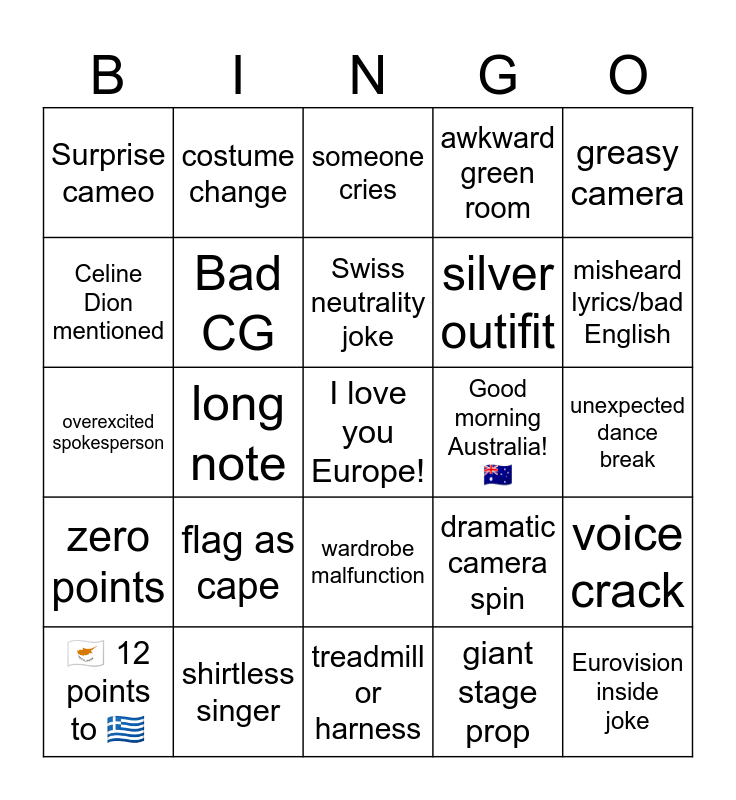 This bingo card has a free space and 24 words: flag as cape, shirtless singer, Swiss neutrality joke, 🇨🇾 12 points to 🇬🇷, greasy camera, Surprise cameo, Celine Dion mentioned, costume change, Good morning Australia!🇦🇺, wardrobe malfunction, silver outifit, overexcited spokesperson, dramatic camera spin, voice crack, Bad CG, giant stage prop, unexpected dance break, someone cries, misheard lyrics/bad English, long note, Eurovision inside joke, zero points, awkward green room and treadmill or harness.