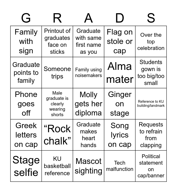 This bingo card has a free space and 24 words: “Rock chalk”, KU basketball reference, Family using noisemakers, Stage selfie, Over the top celebration, Family with sign, Graduate points to family, Printout of graduates face on sticks, Ginger on stage, Graduate makes heart hands, Alma mater, Phone goes off, Song lyrics on cap, Requests to refrain from clapping, Someone trips, Tech malfunction, Reference to KU building/landmark, Graduate with same first name as you, Students gown is too big/too small, Male graduate is clearly wearing shorts, Political statement on cap/banner, Greek letters on cap, Flag on stole or cap and Mascot sighting.