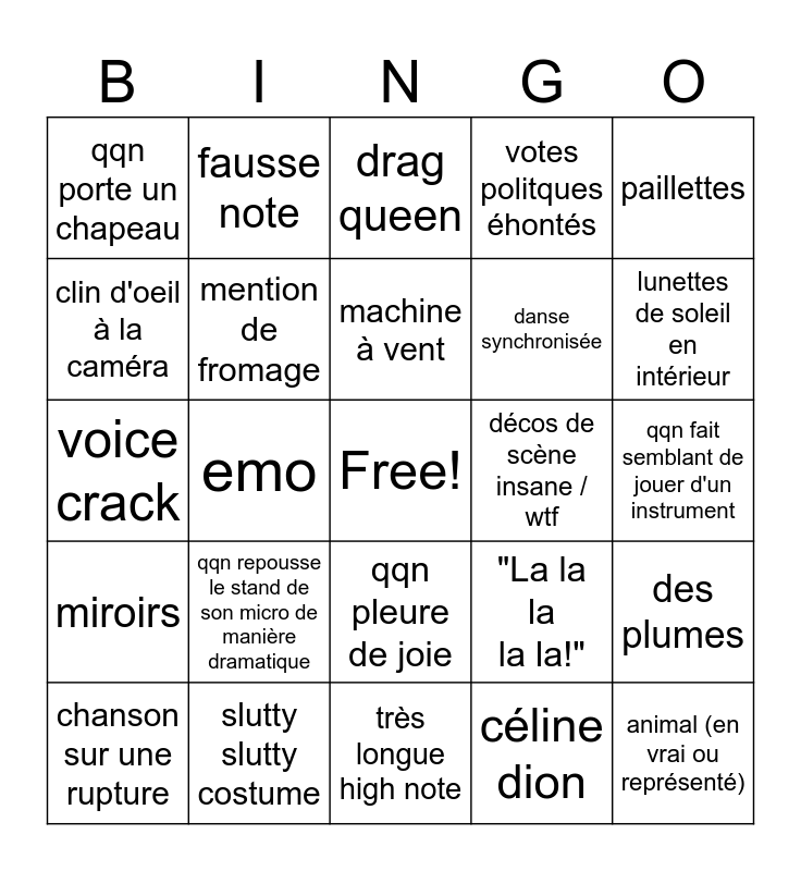 This bingo card has a free space and 63 words: ce pays n'est pas européen lol, le public hue, LE FEU, des plumes, présentateurs changent d'outfit, "merci la suisse pour cette soirée!", fausse note, chanson d'amour, machine à vent, moment ou il faut taper dans les mains, qqn pleure de joie, dramatic key change, qqn fait semblant de jouer d'un instrument, paillettes, pause awkward, clin d'oeil à la caméra, emo, qqn porte un chapeau, épaulettes, danse synchronisée, qqn repousse le stand de son micro de manière dramatique, miroirs, votes politques éhontés, chanson en 2 langues, changement de costume mi-chanson, qqn dans la foule a le visage paint en drapeau, qqn rappe, habits traditionnels, fausse pluie, chanson sur la paix, qqn siffle dans une chanson, les présenta-teurs sont in the trenches pour meubler, disco, outfit en cuir, lunettes de soleil en intérieur, chanson sur une rupture, des ailes, céline dion, danse nulle, mention de fromage, voice crack, décos de scène insane / wtf, "les 12 points vont à....." *pause de 100 ans*, mention de chocolat, animal (en vrai ou représenté), slutty slutty costume, gymnastiques sur scène, "La la la la la!", artiste commence ou finit sa perf sur le sol, protest pour la palestine, appel à la paix et les petits oiseaux, très longue high note, la caméra fait un 360' autour d'un artiste, qqn respire fort dans un micro, moustache de porno, drag queen, on s'embrasse sur scène, awkward israël moment, opéra, yodel, chanson sur la paix, problème de caméra and "Bonsoir Europe et bonjour Australie!".