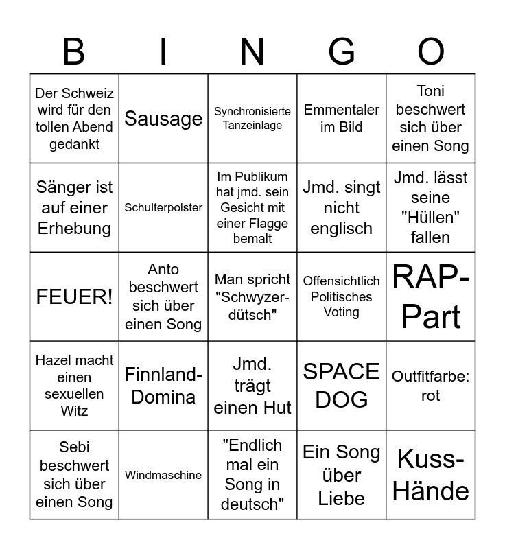 This bingo card has 30 words: Sebi beschwert sich über einen Song, Ein Land bekommt 0 Punkte, Im Publikum hat jmd. sein Gesicht mit einer Flagge bemalt, Telefongeste in Kamera, Toni beschwert sich über einen Song, Der Schweiz wird für den tollen Abend gedankt, Sausage, Jmd. trägt einen Hut, Offensichtlich Politisches Voting, Kuss-Hände, Hazel macht einen sexuellen Witz, Schulterpolster, Sebi sind ein Lied mit, Ein Song über Liebe, Outfitfarbe: rot, schiefer Gesang, Anto beschwert sich über einen Song, Man spricht "Schwyzer-dütsch", SPACE DOG, Jmd. lässt seine "Hüllen" fallen, FEUER!, Windmaschine, Synchronisierte Tanzeinlage, Jmd. singt nicht englisch, RAP-Part, Sänger ist auf einer Erhebung, Finnland-Domina, "Endlich mal ein Song in deutsch", Emmentaler im Bild and Celine Dion wird erwähnt.