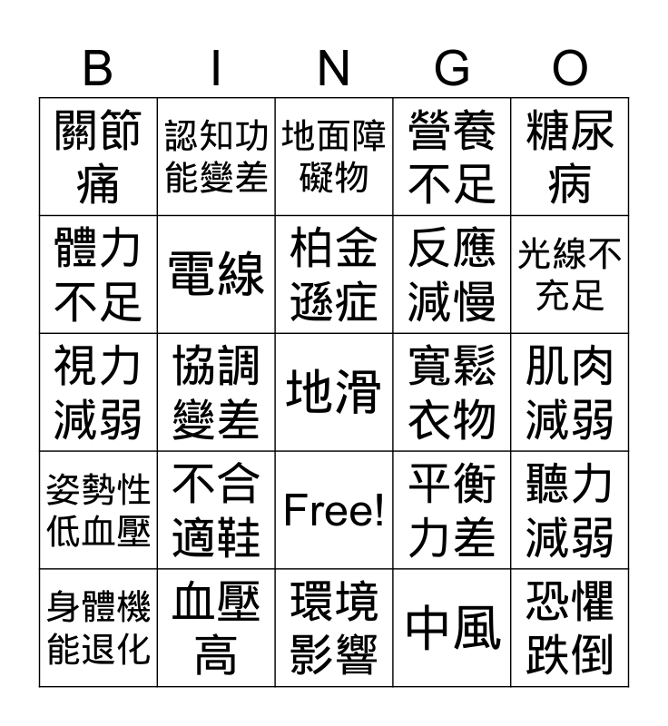This bingo card has 26 words: Free!, 中風, 柏金遜症, 血壓高, 糖尿病, 關節痛, 體力不足, 認知功能變差, 肌肉減弱, 平衡力差, 反應減慢, 視力減弱, 聽力減弱, 身體機能退化, 協調變差, 藥物影響, 營養不足, 姿勢性低血壓, 地面障礙物, 地滑, 光線不充足, 環境影響, 寬鬆衣物, 不合適鞋, 電線 and 恐懼跌倒.