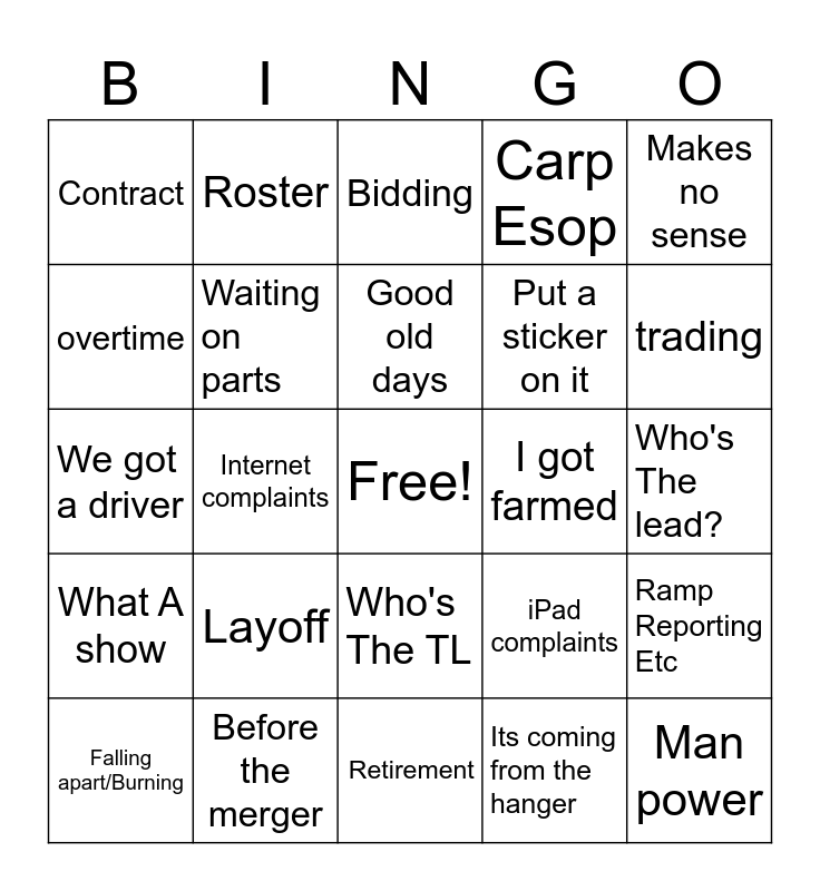 This bingo card has a free space and 24 words: Layoff, Before the merger, Good old days, Falling apart/Burning, Makes no sense, Contract, overtime, Roster, I got farmed, Who's The TL, Put a sticker on it, We got a driver, iPad complaints, Ramp Reporting Etc, Waiting on parts, Its coming from the hanger, Who's The lead?, Bidding, trading, Internet complaints, Man power, What A show, Carp Esop and Retirement.