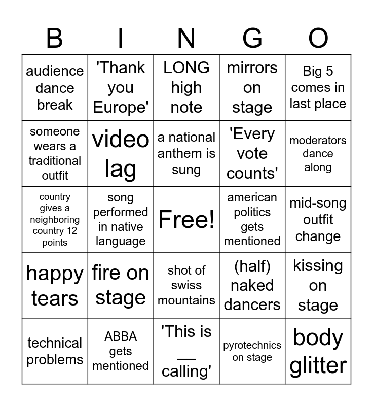 This bingo card has a free space and 24 words: fire on stage, ABBA gets mentioned, a national anthem is sung, technical problems, Big 5 comes in last place, audience dance break, someone wears a traditional outfit, 'Thank you Europe', american politics gets mentioned, shot of swiss mountains, 'Every vote counts', country gives a neighboring country 12 points, (half) naked dancers, kissing on stage, video lag, pyrotechnics on stage, mid-song outfit change, LONG high note, moderators dance along, song performed in native language, body glitter, happy tears, mirrors on stage and 'This is __ calling'.