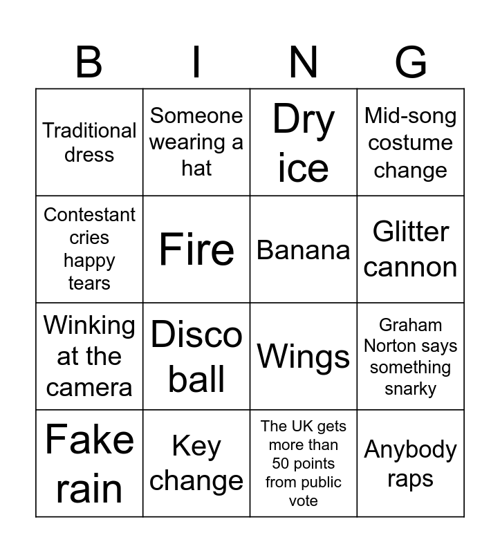 This bingo card has 46 words: Free!, Fake rain, Synchronised dance routine, Someone in the audience with flag facepaint, Feathers, Presenter outfit change, Someone wearing a hat, Thanking host country for a wonderful evening, Fire, Something goes wrong, Banana, Mid-song costume change, A song about love, The UK gets one point from jury, Wind machine, Opera song, Glitter cannon, Key change, Sweden gets twelve jury points, Contestant cries happy tears, Graham Norton says something snarky, Sequins, Traditional dress, Winking at the camera, ABBA is mentioned, Disco ball, Country wearing their flag, Sunglasses indoors, This country isn’t in Europe, Anybody raps, Children singing, Whistling, Guitar solo, Sweden gets more than 50 points from public vote, Nil points, Good evening Europe, The UK gets more than 50 points from public vote, Innuendo, Pleather outfit, Sweden gets one point from jury, Acrobatics, Dry ice, Wings, Twelve points to a neighbour, Clappy bit! and Flute.