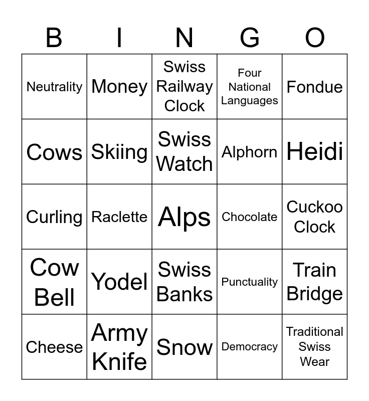 This bingo card has a free space and 24 words: Yodel, Army Knife, Swiss Watch, Cheese, Fondue, Neutrality, Cows, Money, Chocolate, Swiss Banks, Alphorn, Curling, Punctuality, Train Bridge, Skiing, Democracy, Cuckoo Clock, Swiss Railway Clock, Heidi, Raclette, Traditional Swiss Wear, Cow Bell, Four National Languages and Snow.
