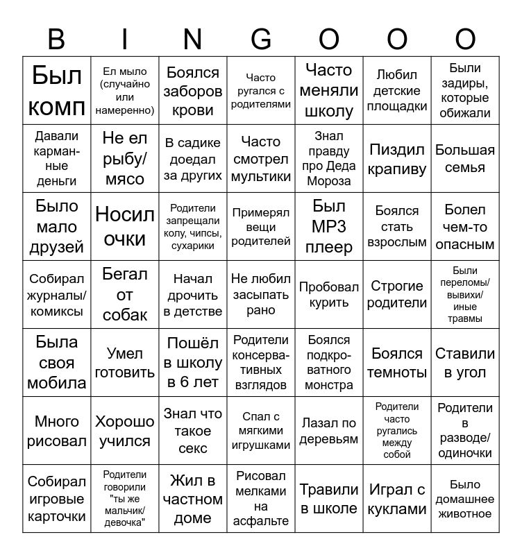 This bingo card has a free space and 48 words: Лазал по деревьям, Пиздил крапиву, Рисовал мелками на асфальте, Бегал от собак, Родители запрещали колу, чипсы, сухарики, Были переломы/вывихи/иные травмы, Ел мыло (случайно или намеренно), Родители говорили "ты же мальчик/девочка", Любил детские площадки, Родители консерва- тивных взглядов, Были задиры, которые обижали, Часто ругался с родителями, Боялся стать взрослым, Был MP3 плеер, Много рисовал, Строгие родители, Давали карман- ные деньги, Большая семья, Родители часто ругались между собой, Часто меняли школу, Знал правду про Деда Мороза, Начал дрочить в детстве, Был комп, Не ел рыбу/мясо, Родители в разводе/одиночки, В садике доедал за других, Болел чем-то опасным, Собирал игровые карточки, Примерял вещи родителей, Носил очки, Играл с куклами, Пробовал курить, Ставили в угол, Хорошо учился, Собирал журналы/комиксы, Боялся подкро- ватного монстра, Боялся темноты, Было мало друзей, Пошёл в школу в 6 лет, Знал что такое секс, Была своя мобила, Было домашнее животное, Боялся заборов крови, Жил в частном доме, Часто смотрел мультики, Спал с мягкими игрушками, Умел готовить and Травили в школе.