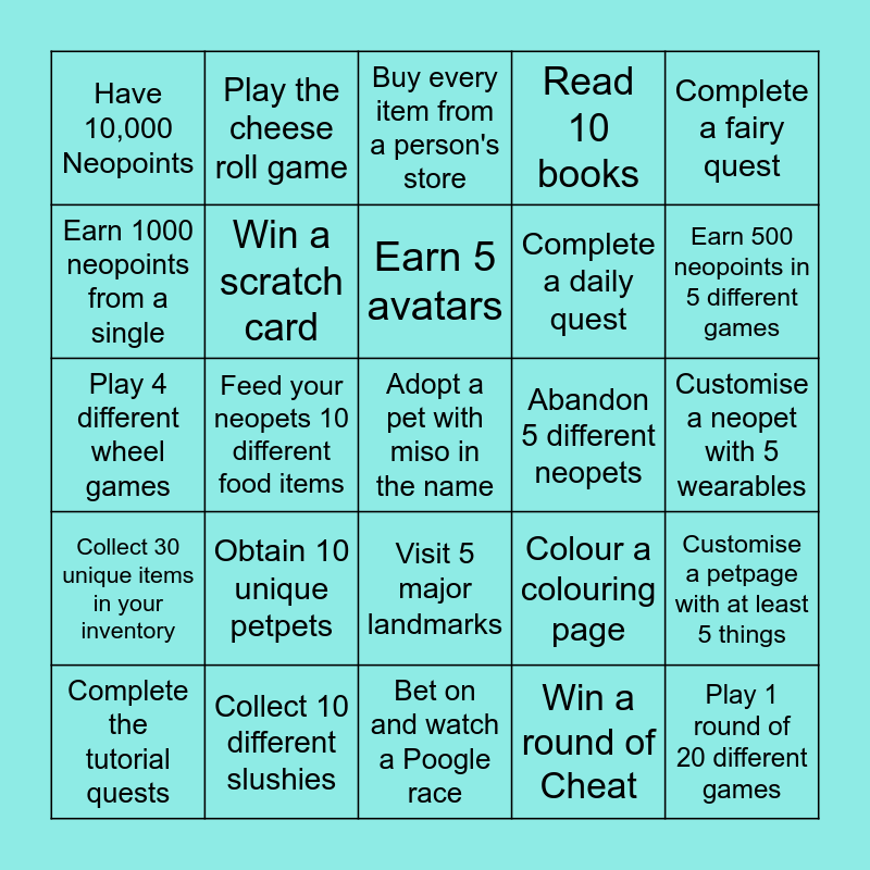 This bingo card has 25 words: Obtain 10 unique petpets, Bet on and watch a Poogle race, Earn 5 avatars, Complete the tutorial quests, Complete a fairy quest, Have 10,000 Neopoints, Earn 1000 neopoints from a single, Play the cheese roll game, Abandon 5 different neopets, Visit 5 major landmarks, Complete a daily quest, Play 4 different wheel games, Colour a colouring page, Customise a petpage with at least 5 things, Win a scratch card, Play 1 round of 20 different games, Customise a neopet with 5 wearables, Buy every item from a person's store, Earn 500 neopoints in 5 different games, Feed your neopets 10 different food items, Adopt a pet with miso in the name, Collect 10 different slushies, Collect 30 unique items in your inventory, Read 10 books and Win a round of Cheat.