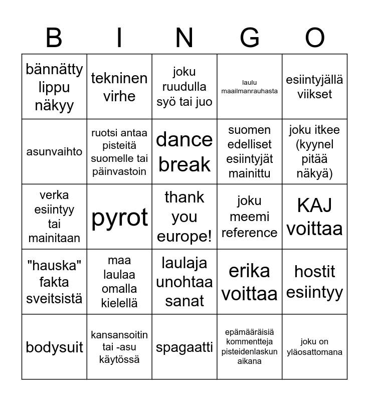 This bingo card has a free space and 24 words: maa laulaa omalla kielellä, kansansoitin tai -asu käytössä, dance break, bodysuit, esiintyjällä viikset, bännätty lippu näkyy, asunvaihto, tekninen virhe, joku meemi reference, laulaja unohtaa sanat, suomen edelliset esiintyjät mainittu, verka esiintyy tai mainitaan, erika voittaa, hostit esiintyy, ruotsi antaa pisteitä suomelle tai päinvastoin, epämääräisiä kommentteja pisteidenlaskun aikana, KAJ voittaa, joku ruudulla syö tai juo, joku itkee (kyynel pitää näkyä), pyrot, joku on yläosattomana, "hauska" fakta sveitsistä, laulu maailmanrauhasta and spagaatti.