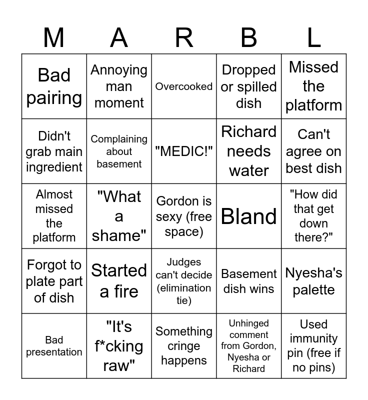 This bingo card has a free space and 24 words: Started a fire, "It's f*cking raw", "MEDIC!", Bad presentation, Missed the platform, Bad pairing, Didn't grab main ingredient, Annoying man moment, Bland, Judges can't decide (elimination tie), Richard needs water, Almost missed the platform, Basement dish wins, Nyesha's palette, Complaining about basement, Unhinged comment from Gordon, Nyesha or Richard, "How did that get down there?", Overcooked, Can't agree on best dish, "What a shame", Used immunity pin (free if no pins), Forgot to plate part of dish, Dropped or spilled dish and Something cringe happens.
