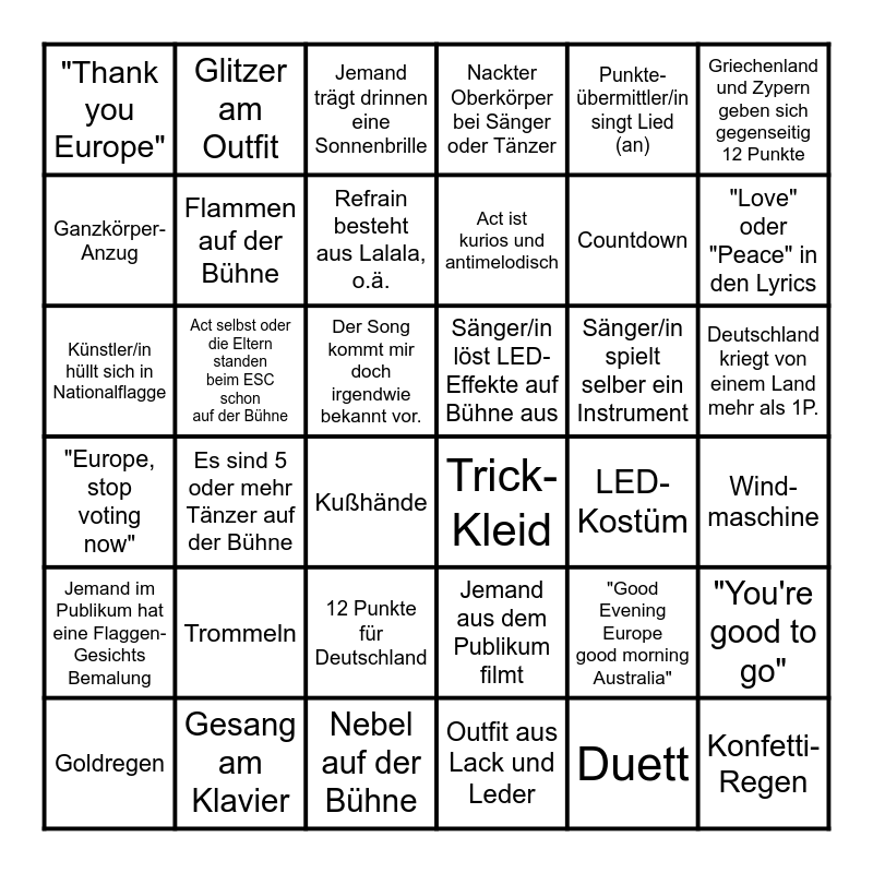 This bingo card has 50 words: Moderator/in hat sich umgezogen, Künstler/in hüllt sich in Nationalflagge, Traditionelles Kostüm / Tracht, LED-Kostüm, Sänger/in spielt selber ein Instrument, Gesang am Klavier, Glitzer am Outfit, Handherzen für die Zuschauer, Griechenland und Zypern geben sich gegenseitig 12 Punkte, Nebel auf der Bühne, Ganzkörper- Anzug, Nackter Oberkörper bei Sänger oder Tänzer, Es sind 5 oder mehr Tänzer auf der Bühne, "Europe, stop voting now", Telefongeste in die Kamera, Jemand aus dem Publikum filmt, Flammen auf der Bühne, Act selbst oder die Eltern standen beim ESC schon auf der Bühne, Eiffelturm bei Punktevergabe aus Frankreich im Bild, Punkte-übermittler/in singt Lied (an), "Love" oder "Peace" in den Lyrics, Wind-maschine, "Thank you Europe", Refrain besteht aus Lalala, o.ä., Akrobatik auf der Bühne, Jemand im Publikum hat eine Flaggen- Gesichts Bemalung, Act ist kurios und antimelodisch, Dem Gastgeber wird für den Abend gedankt, Jemand trägt drinnen eine Sonnenbrille, Deutschland kriegt von einem Land mehr als 1P., Im Greenroom wird angestoßen, "Good Evening Europe good morning Australia", Sänger/in ist Barfuß, Jemand sagt „Grand Prix“, Trick-Kleid, 12 Punkte für Deutschland, Outfit aus Lack und Leder, Duett, Konfetti-Regen, Der Song kommt mir doch irgendwie bekannt vor., Goldregen, Overknees, "You're good to go", Die Halle singt laut hörbar mit, Kußhände, Countdown, Trommeln, Sänger/in steht auf Podest oder ähnlichem, Sänger/in löst LED-Effekte auf Bühne aus and wie aus einem Horrorfilm.