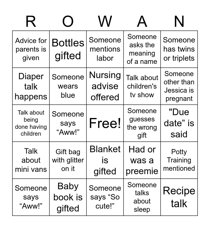 This bingo card has a free space and 29 words: Someone says “Aww!”, Blueberries on food, Someone says “Aww!”, A guest brings a sibling, Advice for parents is given, Someone mentions labor, Someone wears blue, Gift bag with glitter on it, Someone guesses the wrong gift, Baby book is gifted, "Due date” is said, Recipe talk, Someone says “So cute!”, Someone talks about sleep, Someone other than Jessica is pregnant, Someone mentions cravings, Blanket is gifted, Talk about mini vans, Someone has twins or triplets, Talk about being done having children, Had or was a preemie, Have no children, Talk about children's tv show, Diaper talk happens, Someone asks the meaning of a name, Bottles gifted, Potty Training mentioned, Nursing advise offered and Sippy cup spotted.