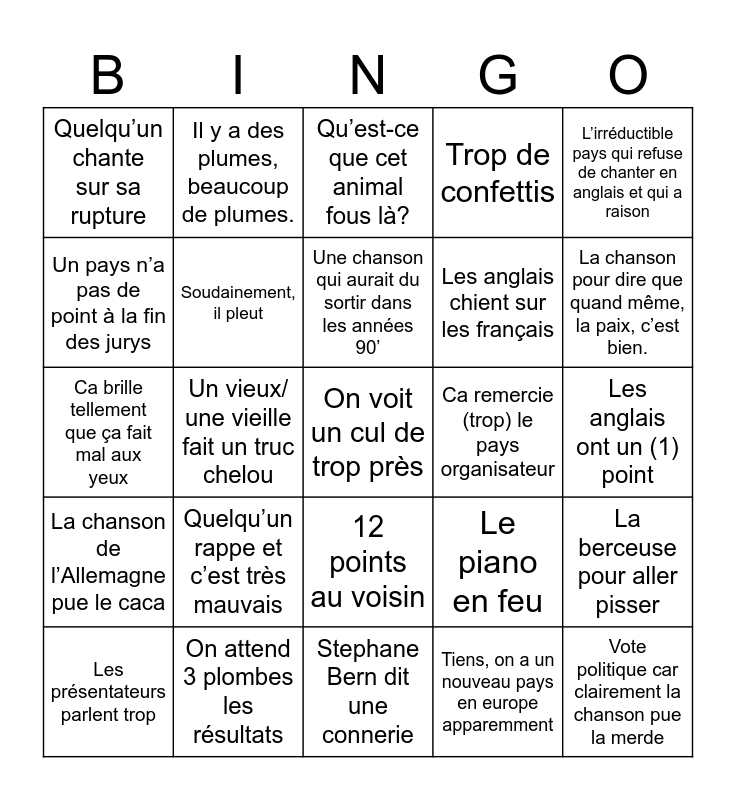 This bingo card has 25 words: Quelqu’un rappe et c’est très mauvais, Stephane Bern dit une connerie, Une chanson qui aurait du sortir dans les années 90’, Les présentateurs parlent trop, L’irréductible pays qui refuse de chanter en anglais et qui a raison, Quelqu’un chante sur sa rupture, Un pays n’a pas de point à la fin des jurys, Il y a des plumes, beaucoup de plumes., Ca remercie (trop) le pays organisateur, 12 points au voisin, Les anglais chient sur les français, Ca brille tellement que ça fait mal aux yeux, Le piano en feu, La berceuse pour aller pisser, Soudainement, il pleut, Vote politique car clairement la chanson pue la merde, Les anglais ont un (1) point, Qu’est-ce que cet animal fous là?, La chanson pour dire que quand même, la paix, c’est bien., Un vieux/ une vieille fait un truc chelou, On voit un cul de trop près, On attend 3 plombes les résultats, La chanson de l’Allemagne pue le caca, Trop de confettis and Tiens, on a un nouveau pays en europe apparemment.
