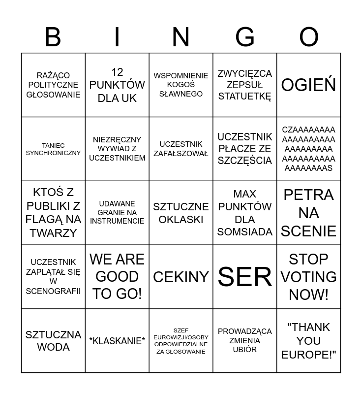 This bingo card has a free space and 24 words: WE ARE GOOD TO GO!, *KLASKANIE*, UCZESTNIK ZAFAŁSZOWAŁ, SZTUCZNA WODA, OGIEŃ, RAŻĄCO POLITYCZNE GŁOSOWANIE, TANIEC SYNCHRONICZNY, 12 PUNKTÓW DLA UK, MAX PUNKTÓW DLA SOMSIADA, CEKINY, UCZESTNIK PŁACZE ZE SZCZĘŚCIA, KTOŚ Z PUBLIKI Z FLAGĄ NA TWARZY, SER, STOP VOTING NOW!, NIEZRĘCZNY WYWIAD Z UCZESTNIKIEM, PROWADZĄCA ZMIENIA UBIÓR, PETRA NA SCENIE, WSPOMNIENIE KOGOŚ SŁAWNEGO, CZAAAAAAAA AAAAAAAAAA AAAAAAAAA AAAAAAAAAA AAAAAAAAS, UDAWANE GRANIE NA INSTRUMENCIE, "THANK YOU EUROPE!", UCZESTNIK ZAPLĄTAŁ SIĘ W SCENOGRAFII, ZWYCIĘZCA ZEPSUŁ STATUETKĘ and SZEF EUROWIZJI/OSOBY ODPOWIEDZIALNE ZA GŁOSOWANIE.