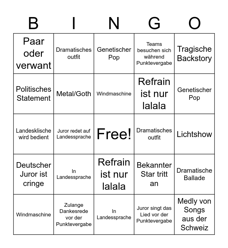 This bingo card has a free space and 25 words: In Landessprache, In Landessprache, Windmaschine, Windmaschine, Tragische Backstory, Paar oder verwant, Politisches Statement, Dramatisches outfit, Dramatisches outfit, Refrain ist nur lalala, Refrain ist nur lalala, Landesklische wird bedient, Bekannter Star tritt an, Dramatische Ballade, Metal/Goth, Lichtshow, Lichtshow, Genetischer Pop, Genetischer Pop, Juror redet auf Landessprache, Medly von Songs aus der Schweiz, Zulange Dankesrede vor der Punktevergabe, Deutscher Juror ist cringe, Teams besuchen sich während Punktevergabe and Juror singt das Lied vor der Punktevergabe.