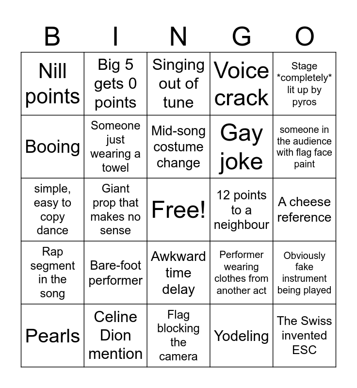 This bingo card has a free space and 24 words: Bare-foot performer, Celine Dion mention, Mid-song costume change, Pearls, Stage *completely* lit up by pyros, Nill points, Booing, Big 5 gets 0 points, 12 points to a neighbour, Awkward time delay, Gay joke, simple, easy to copy dance, Performer wearing clothes from another act, Obviously fake instrument being played, Someone just wearing a towel, Yodeling, A cheese reference, Singing out of tune, someone in the audience with flag face paint, Giant prop that makes no sense, The Swiss invented ESC, Rap segment in the song, Voice crack and Flag blocking the camera.