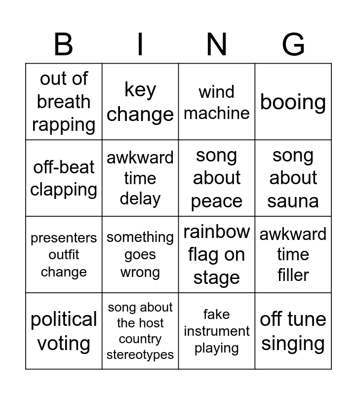 This bingo card has 27 words: Nil points, traditional dancing, presenters outfit change, mid-song outfit change, awkward time delay, wind machine, key change, off tune singing, song about the host country stereotypes, happy tears, rainbow flag on stage, booing, twelve points to neighbor, winking at camera, something goes wrong, song about love, song about peace, song about sauna, glitter, out of breath rapping, fake instrument playing, presenters synchronized dance routine, awkward time filler, political voting, overtly sexual song, off-beat clapping and performers sappy substory.