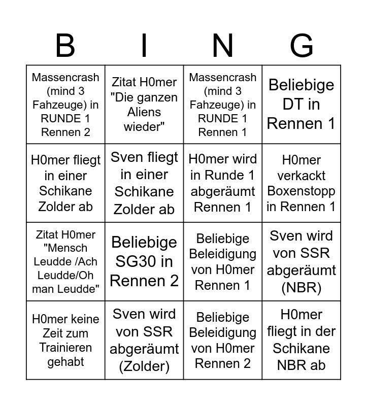 This bingo card has 16 words: Sven wird von SSR abgeräumt (Zolder), Sven wird von SSR abgeräumt (NBR), Massencrash (mind 3 Fahzeuge) in RUNDE 1 Rennen 1, Massencrash (mind 3 Fahzeuge) in RUNDE 1 Rennen 2, Zitat H0mer "Mensch Leudde /Ach Leudde/Oh man Leudde", Zitat H0mer "Die ganzen Aliens wieder", Beliebige Beleidigung von H0mer Rennen 1, Beliebige Beleidigung von H0mer Rennen 2, H0mer fliegt in einer Schikane Zolder ab, Sven fliegt in einer Schikane Zolder ab, H0mer keine Zeit zum Trainieren gehabt, Beliebige DT in Rennen 1, Beliebige SG30 in Rennen 2, H0mer verkackt Boxenstopp in Rennen 1, H0mer wird in Runde 1 abgeräumt Rennen 1 and H0mer fliegt in der Schikane NBR ab.