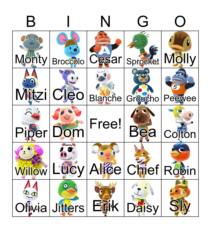 This bingo card has 24 images, a free space and 24 words: Olivia, Lucy, Blanche, Daisy, Molly, Monty, Broccolo, Cesar, Bea, Colton, Piper, Cleo, Chief, Robin, Mitzi, Jitters, Erik, Sprocket, Peewee, Willow, Dom, Alice, Groucho and Sly.