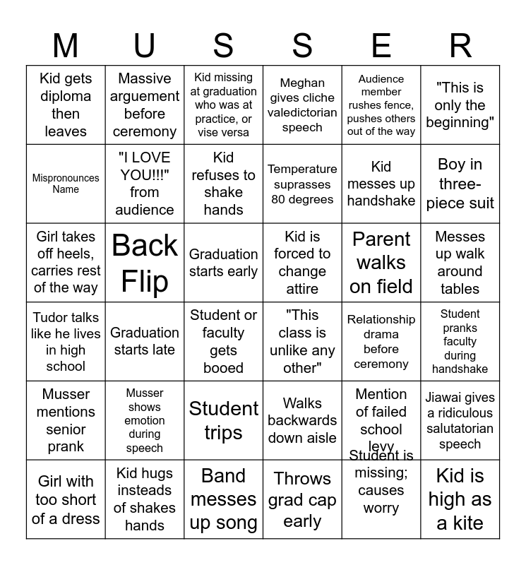 This bingo card has 36 words: Walks backwards down aisle, Student trips, Throws grad cap early, Mispronounces Name, Tudor talks like he lives in high school, Kid is forced to change attire, "I LOVE YOU!!!" from audience, Band messes up song, Audience member rushes fence, pushes others out of the way, Mention of failed school levy, Boy in three-piece suit, Meghan gives cliche valedictorian speech, Jiawai gives a ridiculous salutatorian speech, Back Flip, Temperature suprasses 80 degrees, Kid gets diploma then leaves, Musser mentions senior prank, Parent walks on field, Girl takes off heels, carries rest of the way, Kid missing at graduation who was at practice, or vise versa, Graduation starts early, Graduation starts late, "This class is unlike any other", Student or faculty gets booed, Relationship drama before ceremony, Massive arguement before ceremony, Kid messes up handshake, Kid hugs insteads of shakes hands, Kid refuses to shake hands, "This is only the beginning", Kid is high as a kite, Girl with too short of a dress, Student pranks faculty during handshake, Messes up walk around tables, Musser shows emotion during speech and Student is missing; causes worry.
