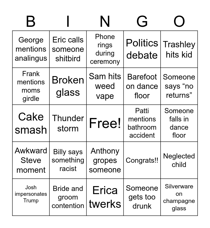 This bingo card has a free space and 25 words: Billy says something racist, Erica twerks, Sam hits weed vape, Josh impersonates Trump, Trashley hits kid, George mentions analingus, Frank mentions moms girdle, Eric calls someone shitbird, Patti mentions bathroom accident, Anthony gropes someone, Barefoot on dance floor, Cake smash, Congrats!!, Neglected child, Broken glass, Someone cries, Someone falls in dance floor, Phone rings during ceremony, Someone says “no returns”, Thunder storm, Silverware on champagne glass, Bride and groom contention, Awkward Steve moment, Politics debate and Someone gets too drunk.