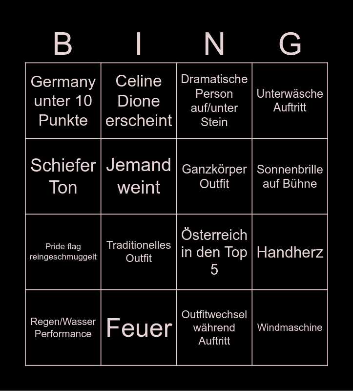 This bingo card has 16 words: Feuer, Handherz, Dramatische Person auf/unter Stein, Germany unter 10 Punkte, Pride flag reingeschmuggelt, Celine Dione erscheint, Österreich in den Top 5, Outfitwechsel während Auftritt, Schiefer Ton, Jemand weint, Regen/Wasser Performance, Unterwäsche Auftritt, Traditionelles Outfit, Sonnenbrille auf Bühne, Ganzkörper Outfit and Windmaschine.