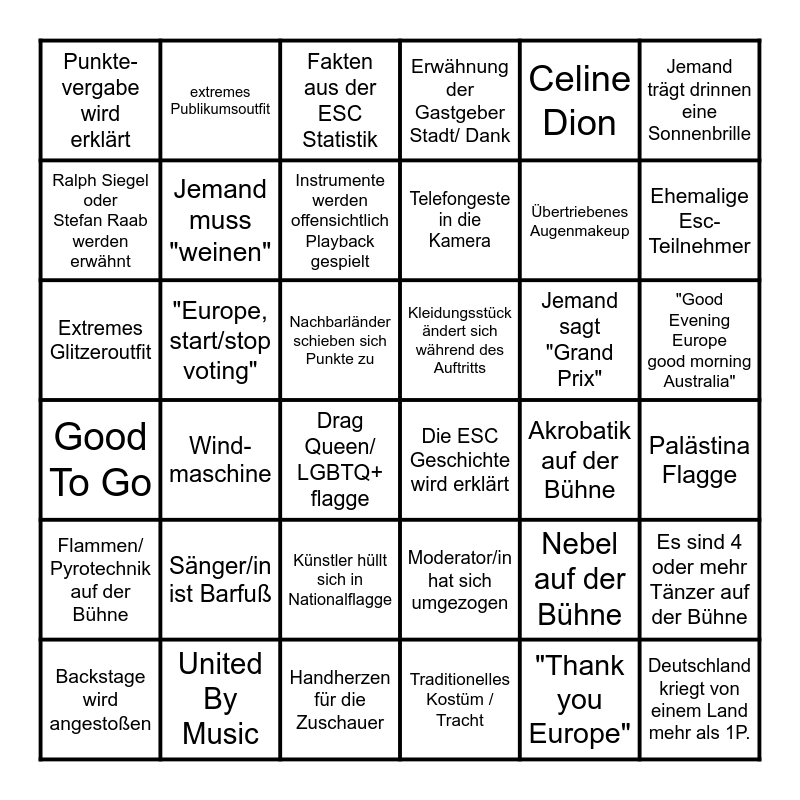 This bingo card has 36 words: Moderator/in hat sich umgezogen, Künstler hüllt sich in Nationalflagge, Traditionelles Kostüm / Tracht, Ralph Siegel oder Stefan Raab werden erwähnt, Good To Go, Kleidungsstück ändert sich während des Auftritts, Jemand muss "weinen", Handherzen für die Zuschauer, Celine Dion, Nebel auf der Bühne, Ehemalige Esc-Teilnehmer, Erwähnung der Gastgeber Stadt/ Dank, Es sind 4 oder mehr Tänzer auf der Bühne, "Europe, start/stop voting", Telefongeste in die Kamera, Punkte-vergabe wird erklärt, Flammen/ Pyrotechnik auf der Bühne, Jemand sagt "Grand Prix", Extremes Glitzeroutfit, Fakten aus der ESC Statistik, Nachbarländer schieben sich Punkte zu, Wind-maschine, Die ESC Geschichte wird erklärt, Drag Queen/ LGBTQ+ flagge, Akrobatik auf der Bühne, extremes Publikumsoutfit, Übertriebenes Augenmakeup, United By Music, Instrumente werden offensichtlich Playback gespielt, Jemand trägt drinnen eine Sonnenbrille, Deutschland kriegt von einem Land mehr als 1P., Backstage wird angestoßen, Palästina Flagge, "Good Evening Europe good morning Australia", Sänger/in ist Barfuß and "Thank you Europe".