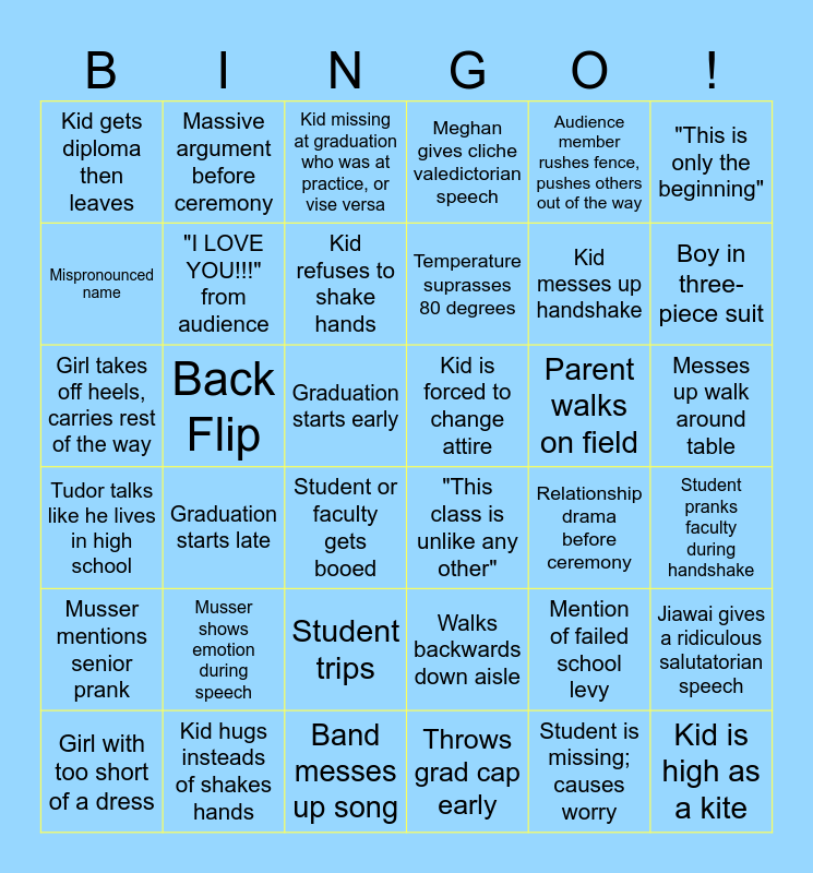 This bingo card has 36 words: Walks backwards down aisle, Student trips, Throws grad cap early, Mispronounced name, Tudor talks like he lives in high school, Kid is forced to change attire, "I LOVE YOU!!!" from audience, Band messes up song, Audience member rushes fence, pushes others out of the way, Mention of failed school levy, Boy in three-piece suit, Meghan gives cliche valedictorian speech, Jiawai gives a ridiculous salutatorian speech, Back Flip, Temperature suprasses 80 degrees, Kid gets diploma then leaves, Musser mentions senior prank, Parent walks on field, Girl takes off heels, carries rest of the way, Kid missing at graduation who was at practice, or vise versa, Graduation starts early, Graduation starts late, "This class is unlike any other", Student or faculty gets booed, Relationship drama before ceremony, Massive argument before ceremony, Kid messes up handshake, Kid hugs insteads of shakes hands, Kid refuses to shake hands, "This is only the beginning", Kid is high as a kite, Girl with too short of a dress, Student pranks faculty during handshake, Messes up walk around table, Musser shows emotion during speech and Student is missing; causes worry.
