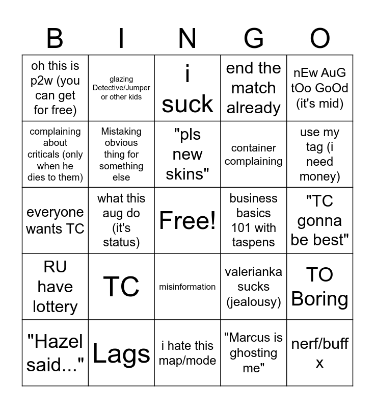 This bingo card has a free space and 24 words: TC, Lags, "pls new skins", "Hazel said...", nEw AuG tOo GoOd (it's mid), oh this is p2w (you can get for free), complaining about criticals (only when he dies to them), glazing Detective/Jumper or other kids, business basics 101 with taspens, misinformation, container complaining, everyone wants TC, valerianka sucks (jealousy), TO Boring, Mistaking obvious thing for something else, "Marcus is ghosting me", "TC gonna be best", i suck, use my tag (i need money), what this aug do (it's status), nerf/buff x, RU have lottery, end the match already and i hate this map/mode.