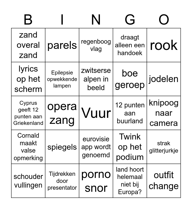 This bingo card has a free space and 29 words: schouder vullingen, Zingt vals, opera zang, zero points, zand overal zand, regenboog vlag, Epilepsie opwekkende lampen, spiegels, 12 punten aan buurland, Tijdrekken door presentator, knipoog naar camera, outfit change, porno snor, land hoort helemaal niet bij Europa?, jodelen, Windmachine, eurovisie app wordt genoemd, Cornald maakt valse opmerking, rook, Cyprus geeft 12 punten aan Griekenland, Twink op het podium, Vuurwerkje afsteken, boe geroep, lyrics op het scherm, draagt alleen een handoek, parels, strak glitterjurkje, zwitserse alpen in beeld and Frankrijk geeft punten in het frans.
